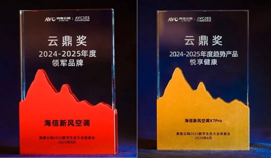 在奥维云网2025年8月举办的数字生态大会上,海信空调凭借行业第一的市场表现与多项产品创新,获得了智慧家庭领域权威奖项云鼎奖的“空调行业领军品牌”与“悦享健康年度趋势产品”两项荣誉。