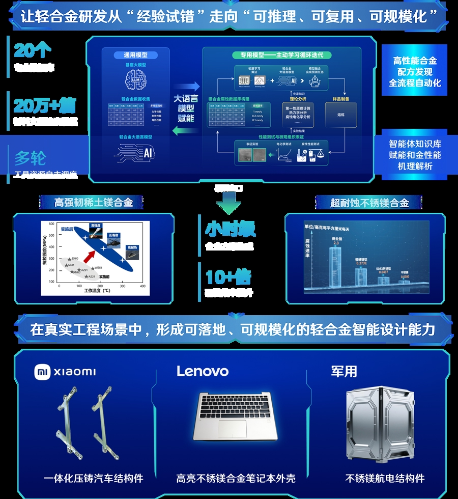 材料学院饶梓元团队"DeepLight轻合金大模型"聚焦轻合金成分工艺强耦合及实验成本高的难题。融合知识推理与深度学习,构建万条推理链条,实现小时级合金设计,效率提升1个数量级,成功设计出腐蚀速率0.027毫米/年的高耐蚀镁合金。
